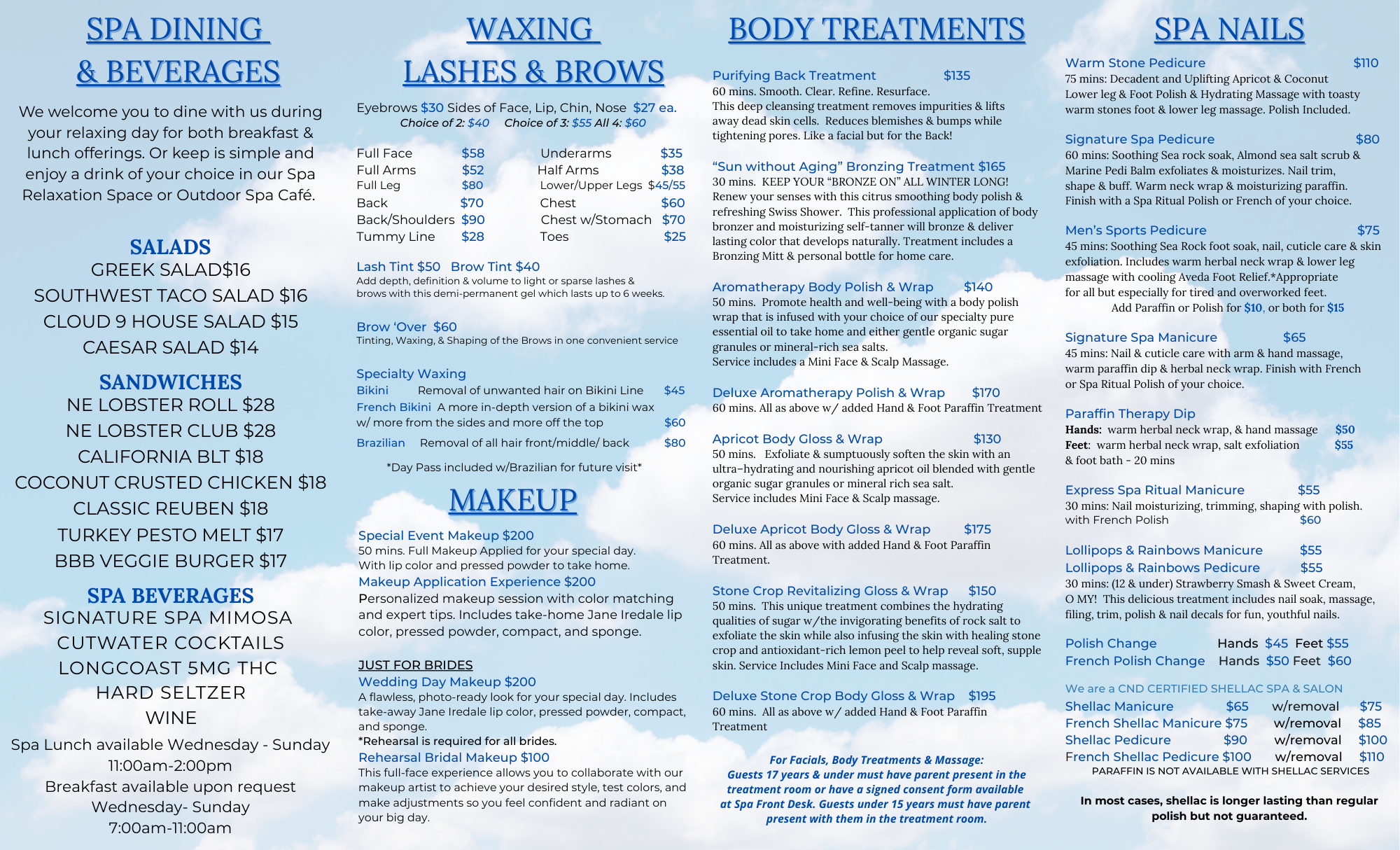 All menu items include filtered water w/ lemon. Additional beverage selections available upon request.